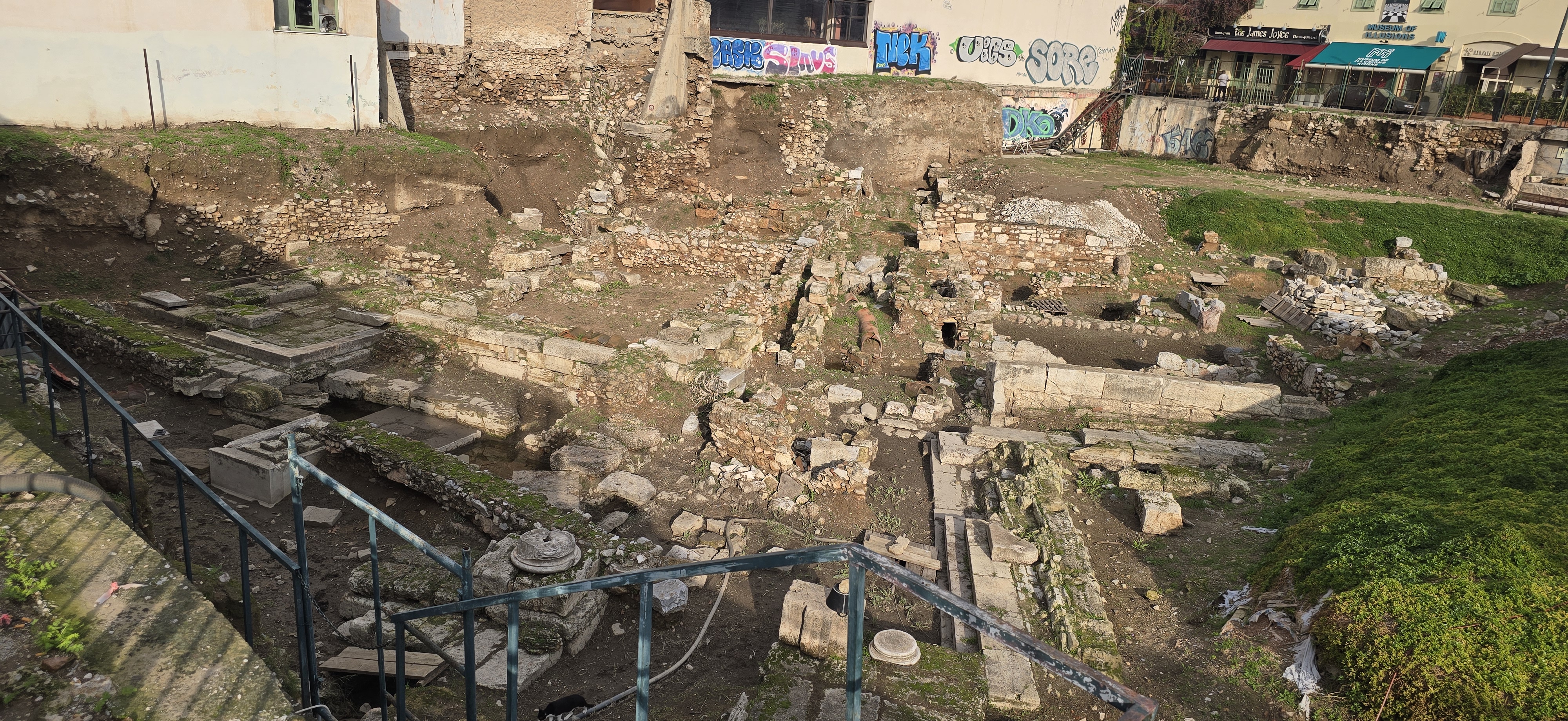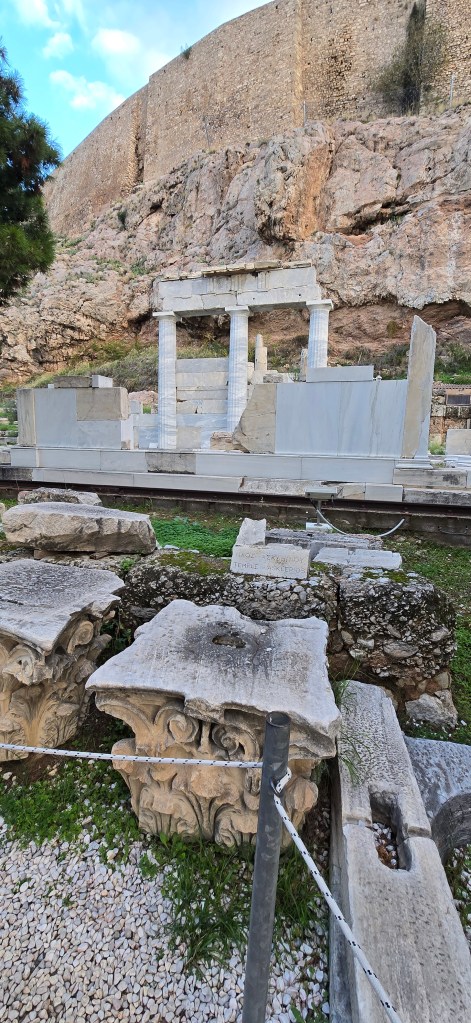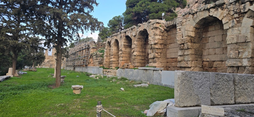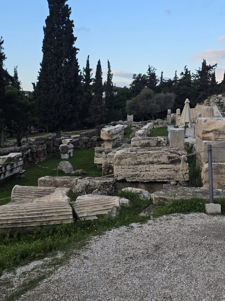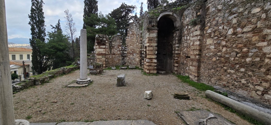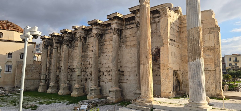 Nearby is Hadrian’s Library, built in 132 AD by Emperor Hadrian — a Roman love letter to Athens. A massive complex that once held scrolls, lecture halls, and courtyards.