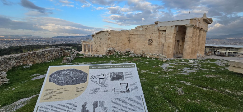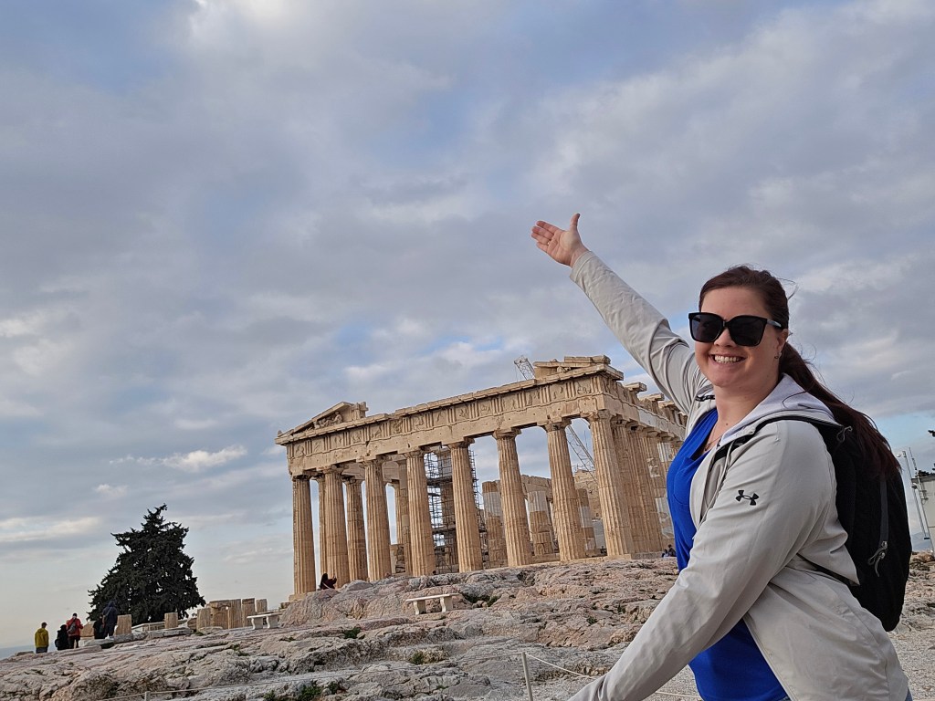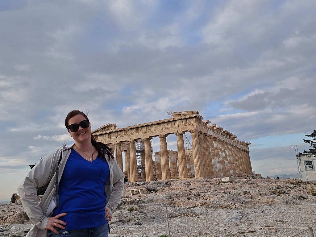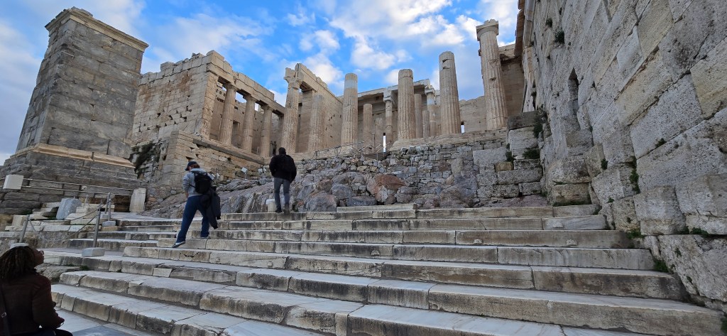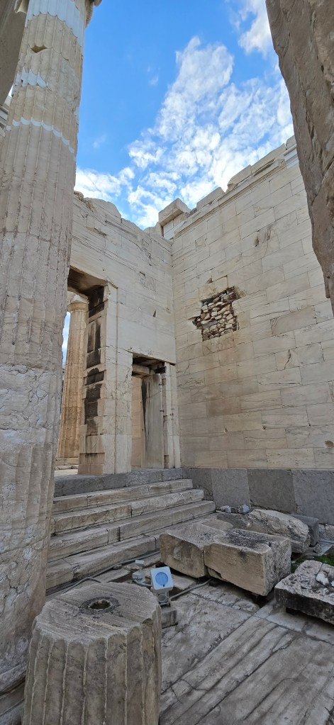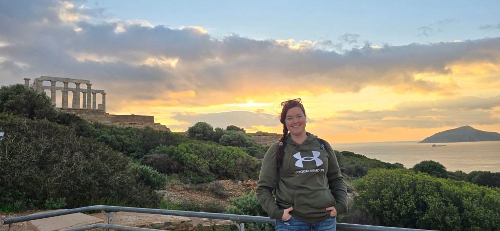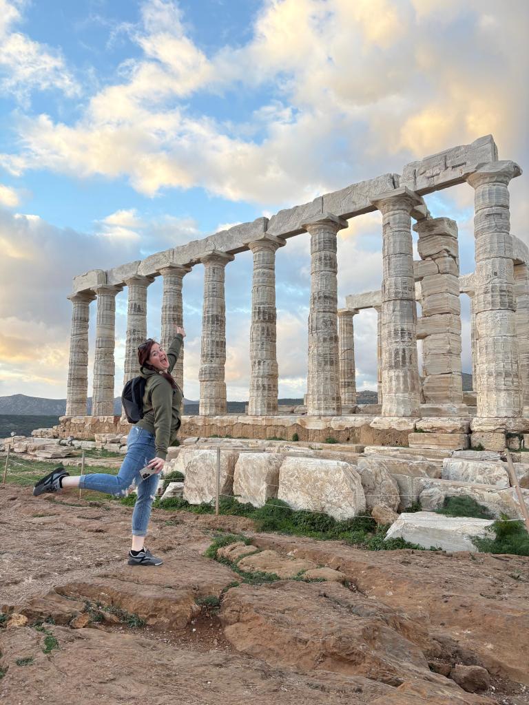 The cliffs fall sharply into endless blue. The temple’s marble columns rise — weathered, fractured, but steady. The wind moves differently there — steady and insistent, though not nearly as fierce as Scotland’s. It feels less wild, more watchful.