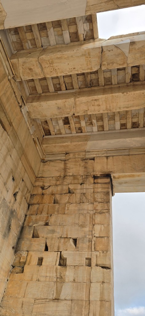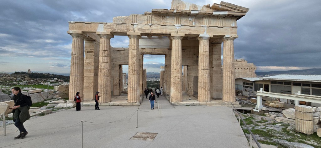 To the east stands the Stoa of Attalos, reconstructed in the 1950s. Once a two-story colonnade for commerce and gathering — now a museum. Again: ancient bones, modern rebuilding.