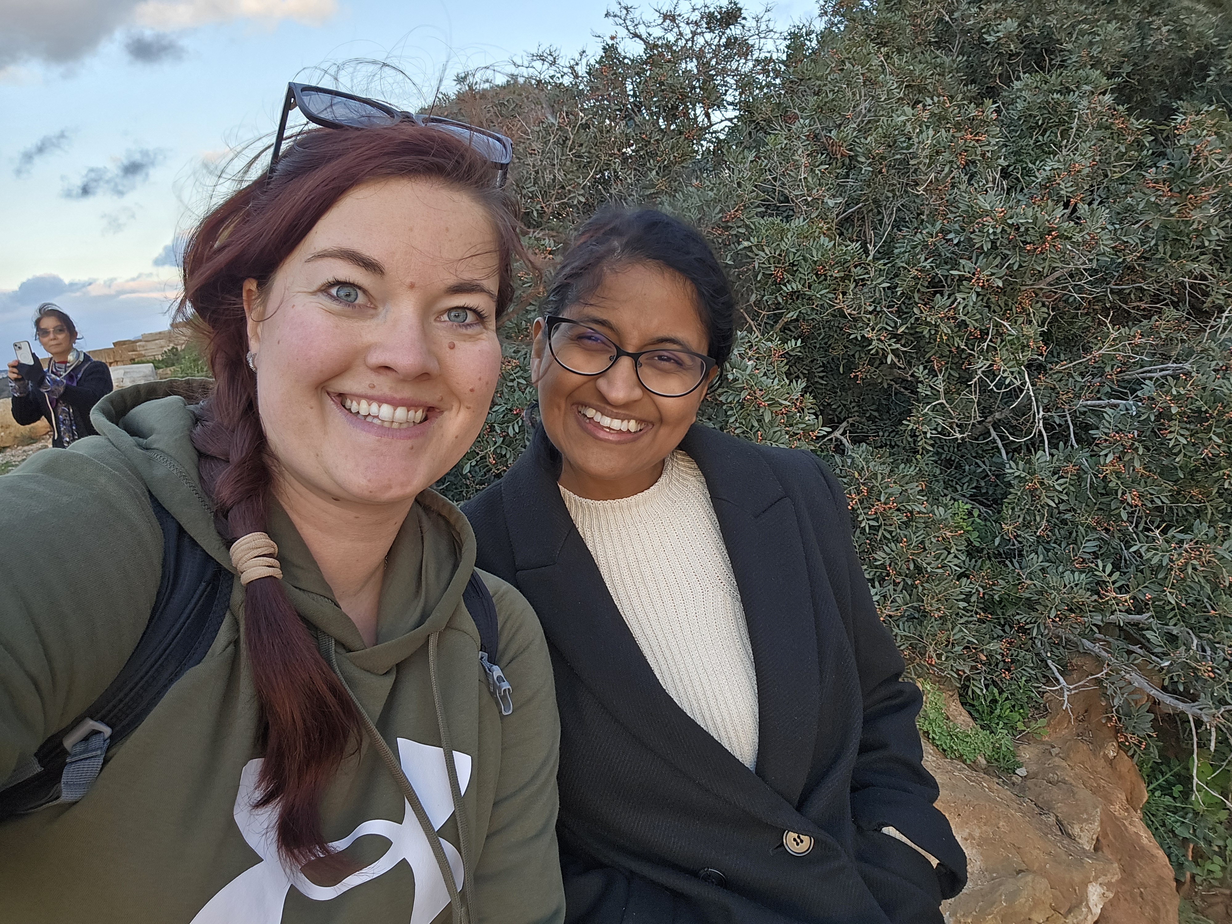 I walked the perimeter slowly, golden light catching in the stone, shadows stretching longer across the ground. And just as I reached the main columns, my rooftop dinner friend arrived with her tour group.