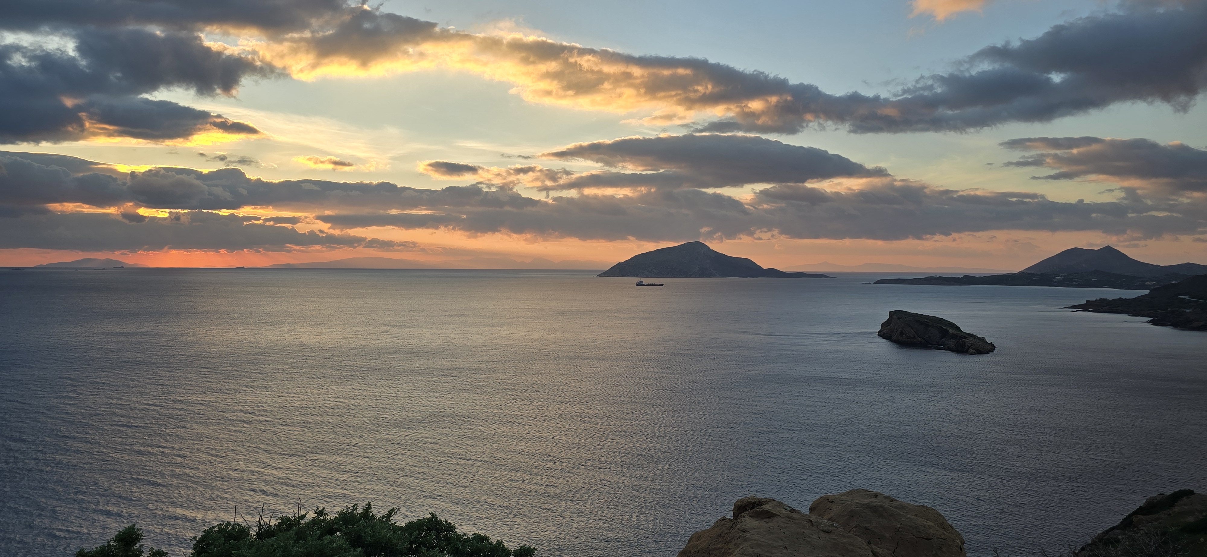 The yellow-orange light cast a warm halo against the cooler blues of the sky, while the Aegean below remained a heavier, richer shade — as if the water refused to surrender to the fire above it. It felt like watching two elements meet without ever touching.