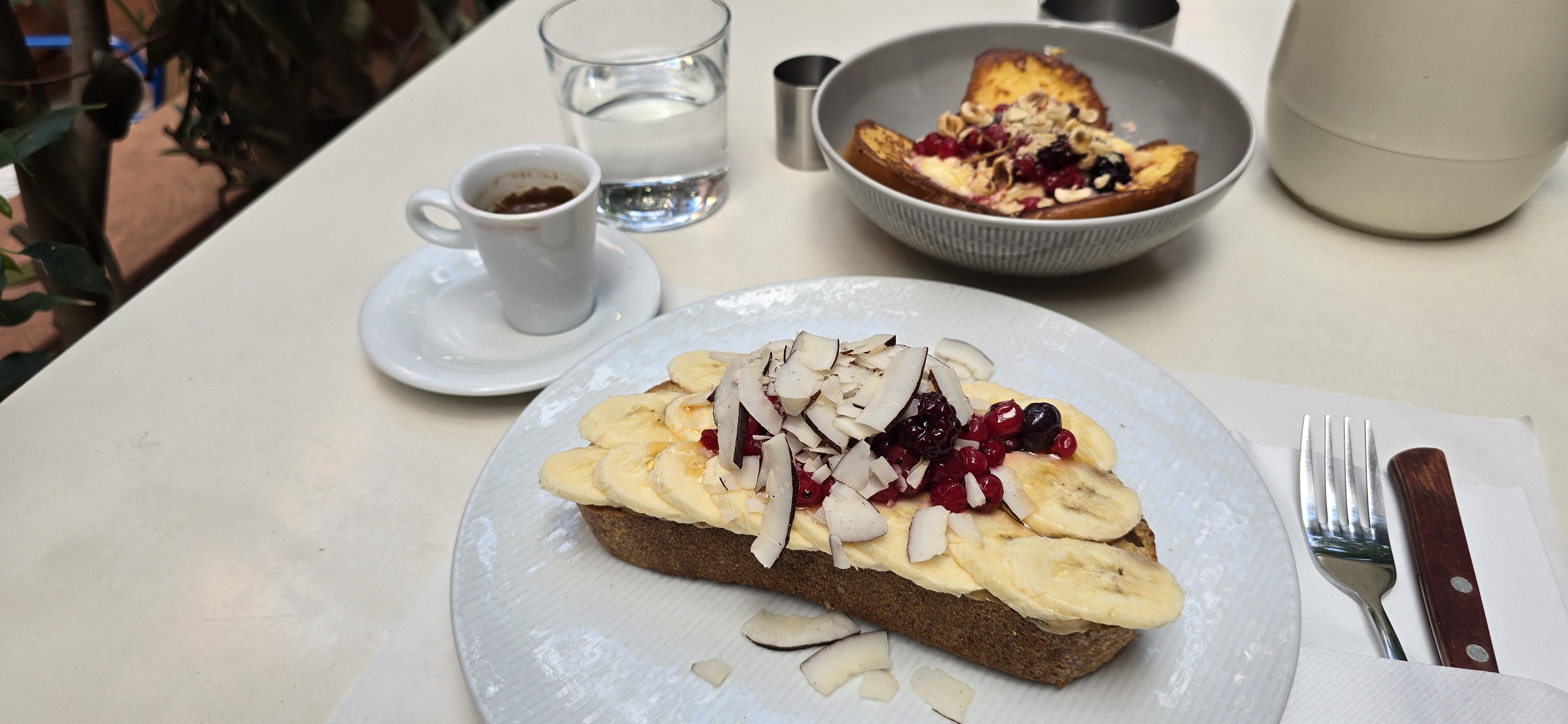 One was banana toast — peanut butter, banana, forest fruits, coconut, and agave syrup on sourdough. Bright, fresh, and layered with flavor.