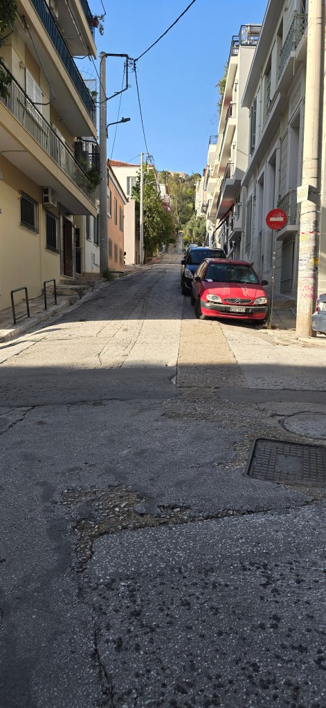 Walking those paths, it was easy to imagine ancient Greeks moving through the same terrain — philosophers, messengers, citizens navigating these hills long before modern roads existed. I record little voice notes for myself while traveling, and one of them captures me panting and saying, “This would be much more fun side-by-side.” The terrain actually reminded me of Heart Attack Hill — for those of you who know it, you know exactly what I mean.