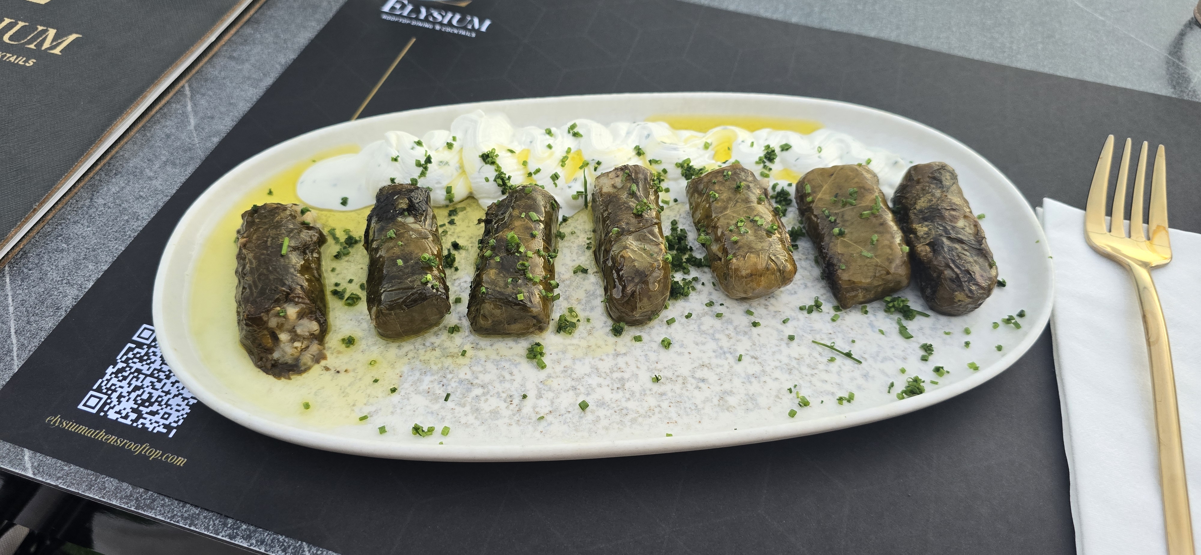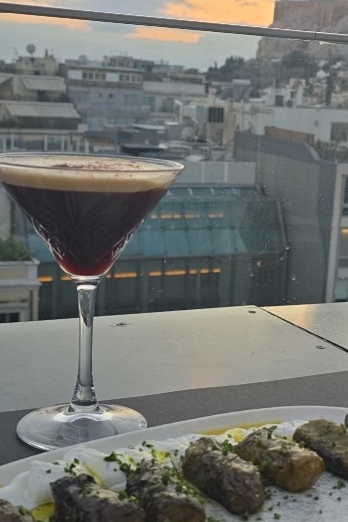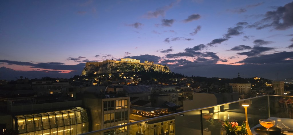 Dinner that evening was at Elysium, a rooftop restaurant perched high above the city, with a direct view toward the Acropolis. I chose a seat at the very edge of the balcony — the kind of place where you don’t just see the view, you sit inside it.