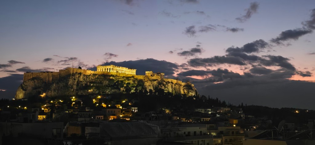 As the sun began to set, the city softened. Rooftops stretched out below me in quiet layers, and beyond them the Acropolis rose — steady, ancient, and impossibly present. The light shifted slowly, clouds catching gold and gray, the Parthenon standing watch as if it had done so every evening for thousands of years. It felt reverent without trying to be.