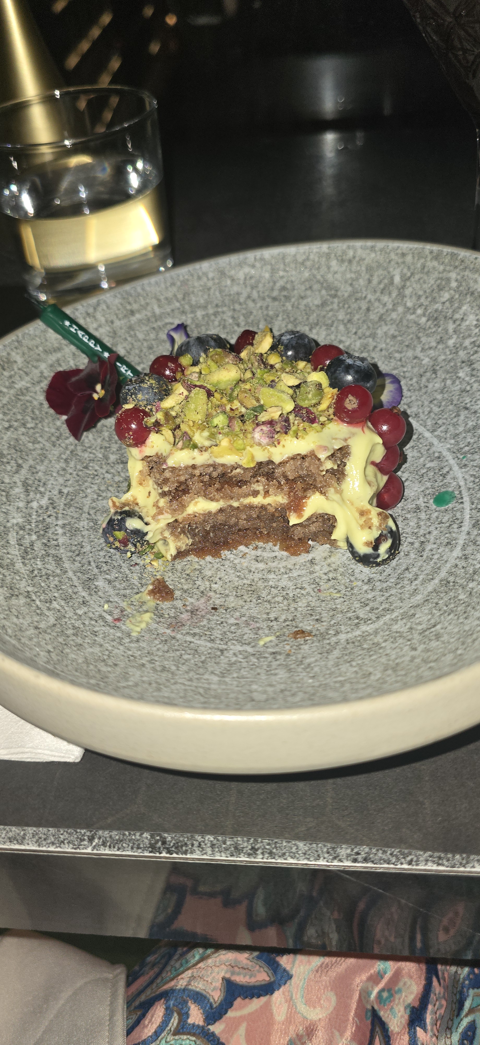 At some point, the manager overheard that it was my birthday. Without warning, a dessert appeared — pistachio frosting layered over a soft cake center, crowned with berries, tiny flowers, and a single candle. I still don’t know exactly what it was, but it felt like a gift rather than an item on a menu.