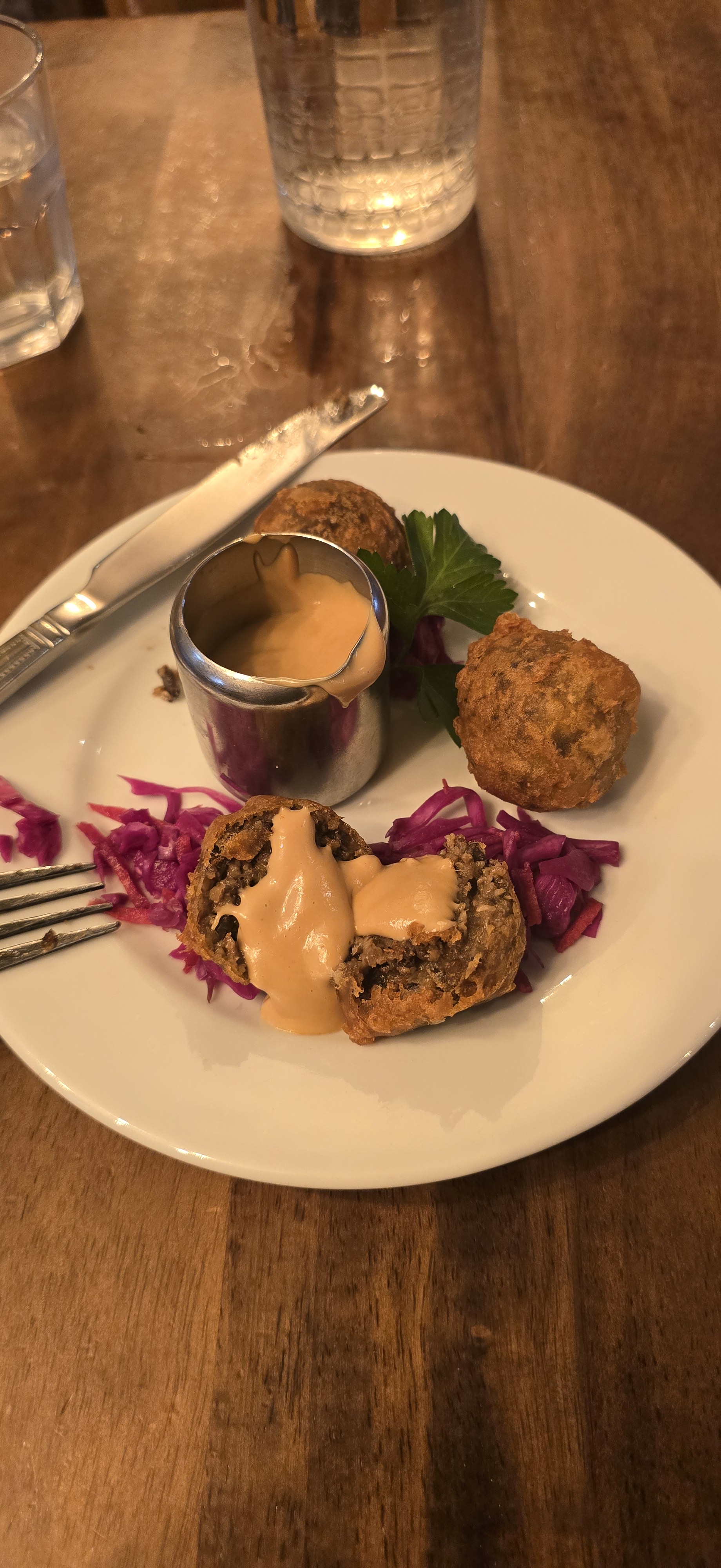 It arrived fried 🍳, which I figured was a good sign. Everything’s better fried… and you know what? It actually was! Crispy on the outside, flavorful on the inside 😋, and paired with a rich, savory sauce 🍯 that pulled it all together. I went in cautiously and came out a haggis believer (well… at least the fried kind).